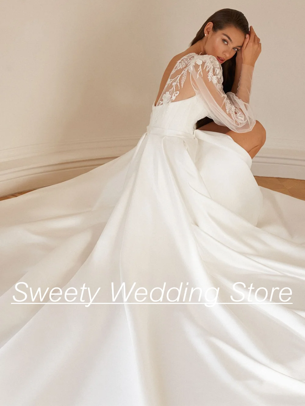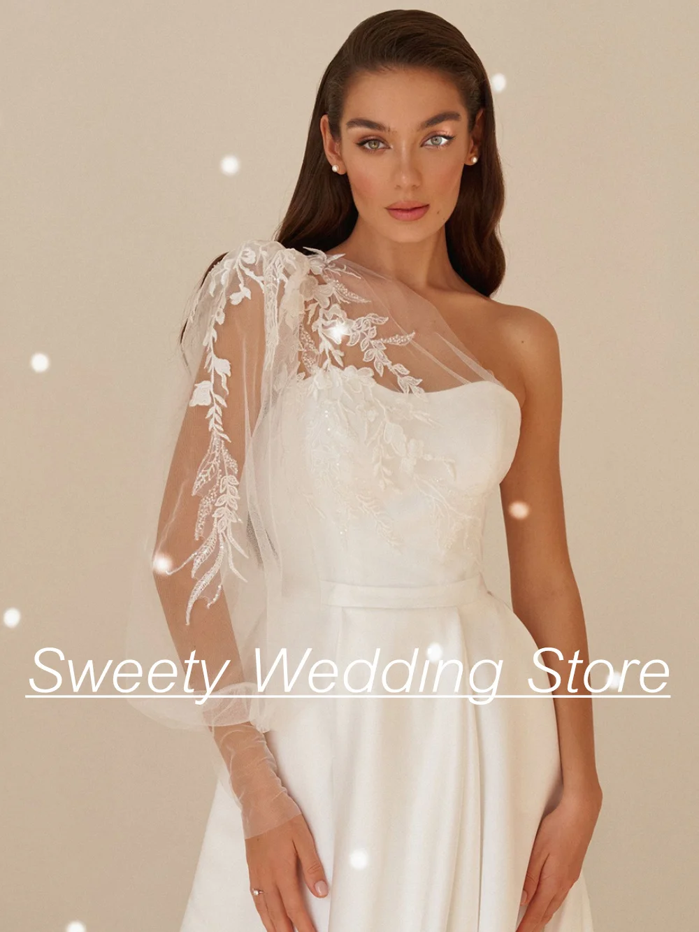 Woman Wedding Dresses for Bride 2025 Elegant One Shoulder Puff Sleeve Applique Court Train Backless A Line Satin Bridal Gown